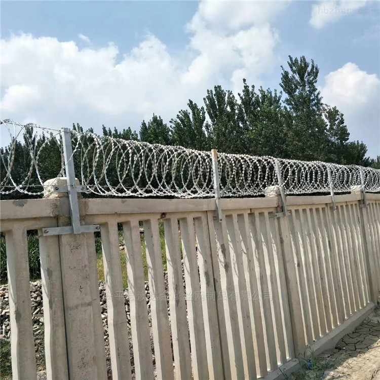 鐵路刺絲滾籠防護(hù)柵欄主要包括刀片剌網(wǎng),刺繩,和支架及卡扣等。安裝好后具有很好的阻嚇效果,與能起到相同作用的產(chǎn)品比起來性價比是高很多的。主要制作工藝就是由熱鍍鋅鋼板或者不銹鋼鋼板沖壓出尖銳的刀片,然后由高張力鍍鋅鋼絲或者不銹鋼絲來做芯線組合構(gòu)成的防護(hù)產(chǎn)品。配合立柱支架、加密支架、臺階支架安裝在水泥立柱上起到固定的作用,一般間隔3米安裝一個。