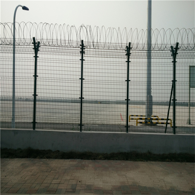 機場網(wǎng)圍欄規(guī)格最常見的是:鋼筋網(wǎng)片一般為墨綠色,外形尺寸2*3m,網(wǎng)孔5*50cm,絲徑5mm,上端有V型支架用來固定刀刺滾籠,加強二次防護功能。機場護欄網(wǎng)立柱采用80*60*6mm矩形鋼管,預(yù)埋0.5m左右,整體進行熱鍍鋅和熱浸塑處理,防腐功能強、使用壽命長,是使用量最廣泛的機場圍界樣式。