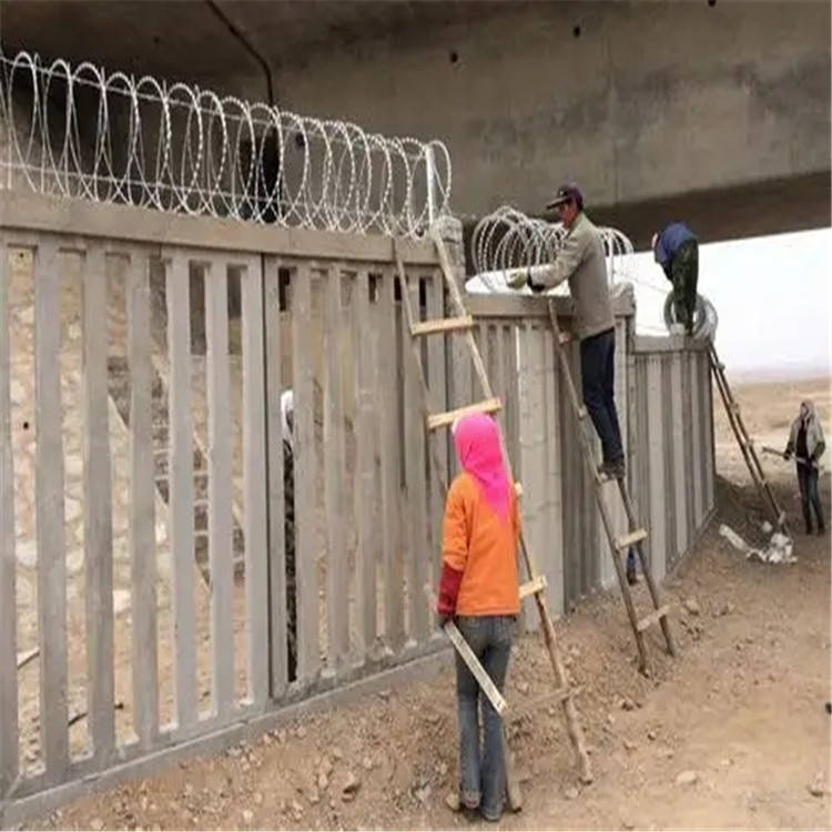 刺絲滾籠安裝工人一定要戴好專用手套,防止被刺絲滾籠扎破。工人不要年齡太大,防止從水泥柵欄上面滑落,造成人員傷亡。安裝刺絲滾籠時一-定要做到“"嚴直齊美、 間距均勻”美觀和防護的雙結合。刺絲連接卡的位置,施工中 ,首先要把縱向拉筋拉直,兩道拉筋成平行狀態(tài);均勻的把刺絲滾籠分開,固定加密支架,隨后加固刺絲連接卡。