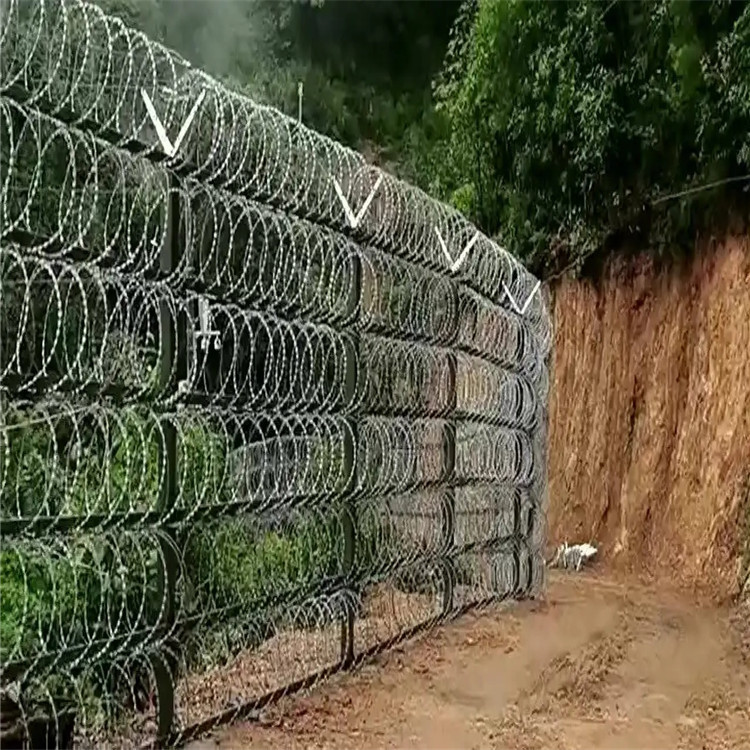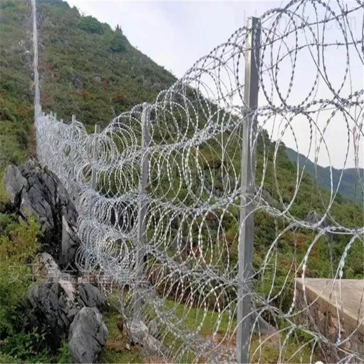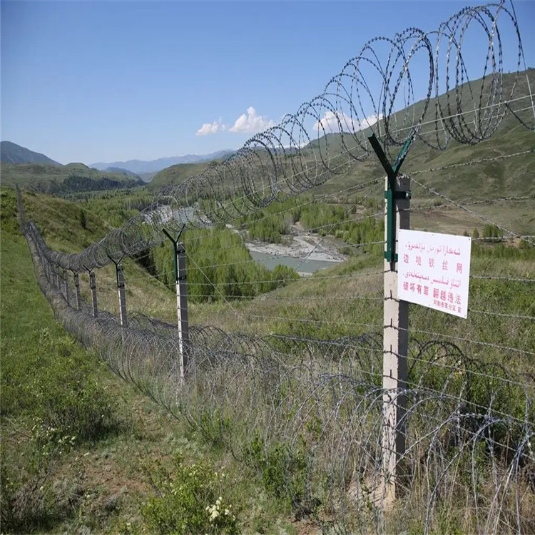 工程案例邊防警戒線圍欄網(wǎng),防攀爬隔離網(wǎng),監(jiān)獄刀片刺網(wǎng)隔離網(wǎng),梅花刺隔離網(wǎng)主要用于監(jiān)獄、看守所、戒毒所、哨所、邊防等的圈禁防護(hù)。梅花刺隔離網(wǎng)由美格網(wǎng)和梅花刺片(因其外形類似梅花得名)組合而成的阻絕器材。由于梅花刺隔離網(wǎng)造形獨(dú)特不易觸摸,因而能達(dá)到很好的防護(hù)隔離效果。既美觀又讓人不寒而粟。起到了很好的阻嚇作用。