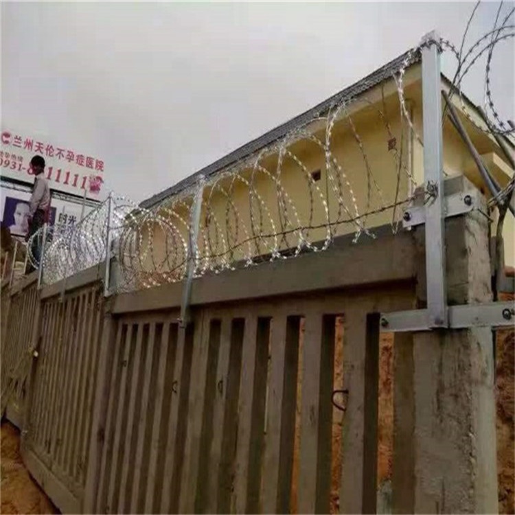 工程案例刺網(wǎng)芯線直徑為2.5mm,刀片長22mm,刀片寬度15mm,刀片厚度0.5mm。 蛇腹形刀刺網(wǎng)的排列密度不小于16圈/米,相鄰每圈間距不大于120mm 。一般每3米安裝一個支架,材質(zhì)有鍍鋅的或不銹鋼的。