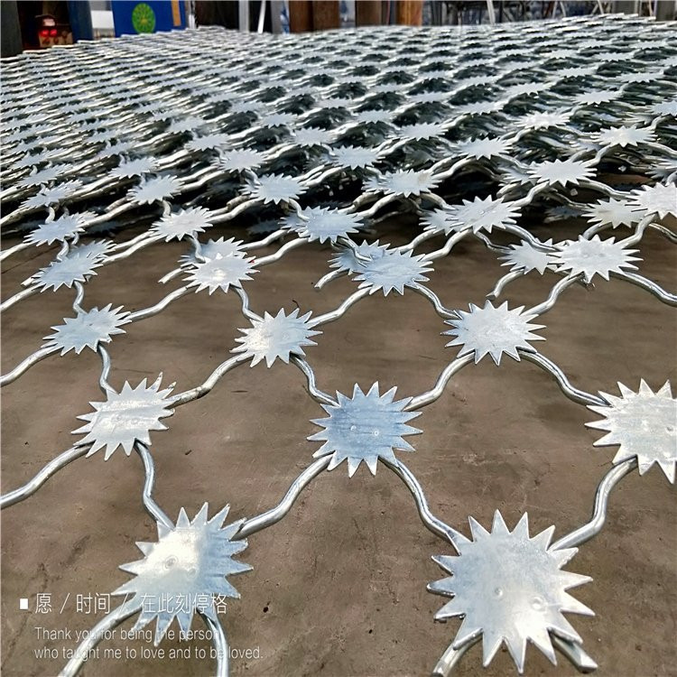 5、刀片滾網(wǎng)、拉絲、卡扣,均選用不銹鋼原料。刀刺網(wǎng)裝置固定卡扣全體調(diào)正,使刀刺網(wǎng)不呈現(xiàn)擰轉(zhuǎn)狀況,刀刺刺圈分布均勻,每隔30-40cm與拉絲固定;分段銜接處需將兩端刀刺網(wǎng)做銜接固定,刀刺網(wǎng)固定點需緊鎖不得呈現(xiàn)松動、掉落現(xiàn)象;刀刺網(wǎng)裝置與阻隔網(wǎng)平行,上下左右均成直線延伸,轉(zhuǎn)角處需做加密加固處理。