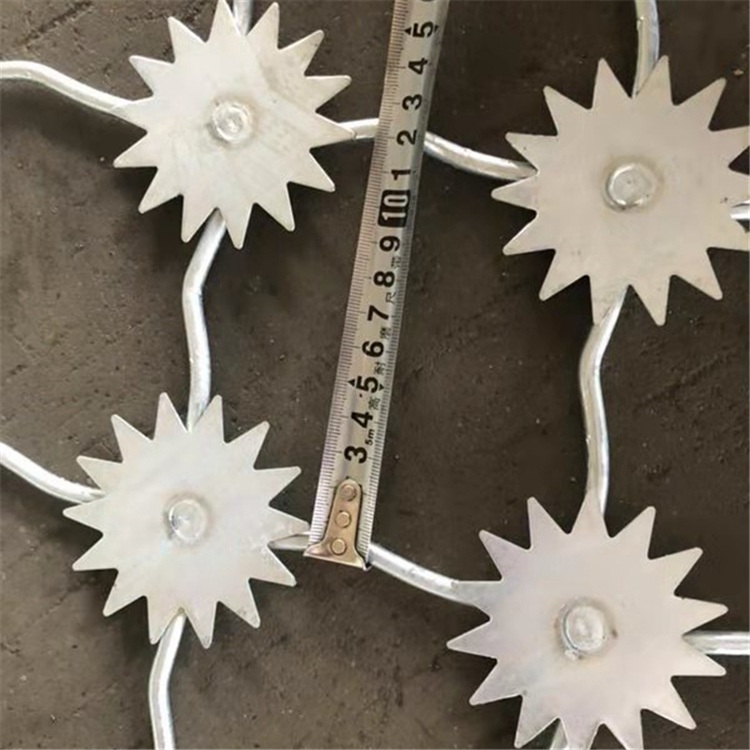 新聞動(dòng)態(tài)太陽(yáng)花刺片美格網(wǎng)常用于監(jiān)獄鋼網(wǎng)墻制作,是非常堅(jiān)固牢靠防攀爬的太陽(yáng)花刺片美格網(wǎng)鋼網(wǎng)墻,在日常生活中,我們熟悉的美格網(wǎng)就是居民家中防盜窗那樣的,孔型優(yōu)美.牢固,不過(guò)我們今天說(shuō)的美格網(wǎng)和工平常接觸的美格網(wǎng)可不一樣。我們今天說(shuō)的美格網(wǎng)在每個(gè)交點(diǎn)處都焊接了太陽(yáng)花刺片。刺片采用太陽(yáng)花形狀設(shè)計(jì),此設(shè)計(jì)不僅美觀大方,而且具有極強(qiáng)的防護(hù)力。每個(gè)刺片有14個(gè)花刺,焊接固定在美格網(wǎng)上。由于花詞密集不易觸摸,一般作用于監(jiān)獄、看守所、戒毒所等等做為外網(wǎng)、大門通道等等。下面是太陽(yáng)花刺片監(jiān)獄鋼網(wǎng)墻的材料介紹。
