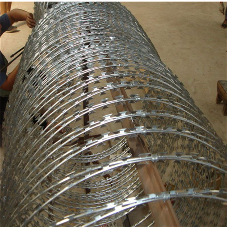 工藝:它采用鋼板(刀板)沖壓成型包附于熱鍍鋅鋼絲(芯線)之上,由銳利尖角鍍鋅鋼板或不銹鋼薄板做刀片,高張力鋼絲做芯線組合而成的。