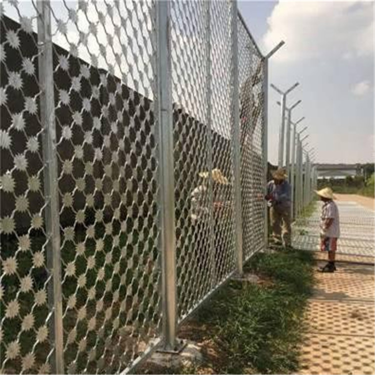監(jiān)獄金屬隔離網在生產形式及產品原材料的不同上邊有幾種類型,常見的鋼絲網片型或者焊接刀片刺繩網片型,這兩種只是網片上邊的材料不同,立柱邊框都是可以通用的。還有一種特殊護欄網片:358網片,是358密紋護欄網中的一部分:網片是跟一種特殊的網片,網孔比較密小,對焊接技術和機器要求比較高。還有梅花刺片隔離網,由美格網和梅花刺片(因其外形類似梅花得名)組合而成的阻絕器材。由于梅花刺片隔離網造形獨特不易觸摸,因而能達到很好的防護隔離效果。既美觀又讓人不寒而粟。起到了很好的阻嚇作用。