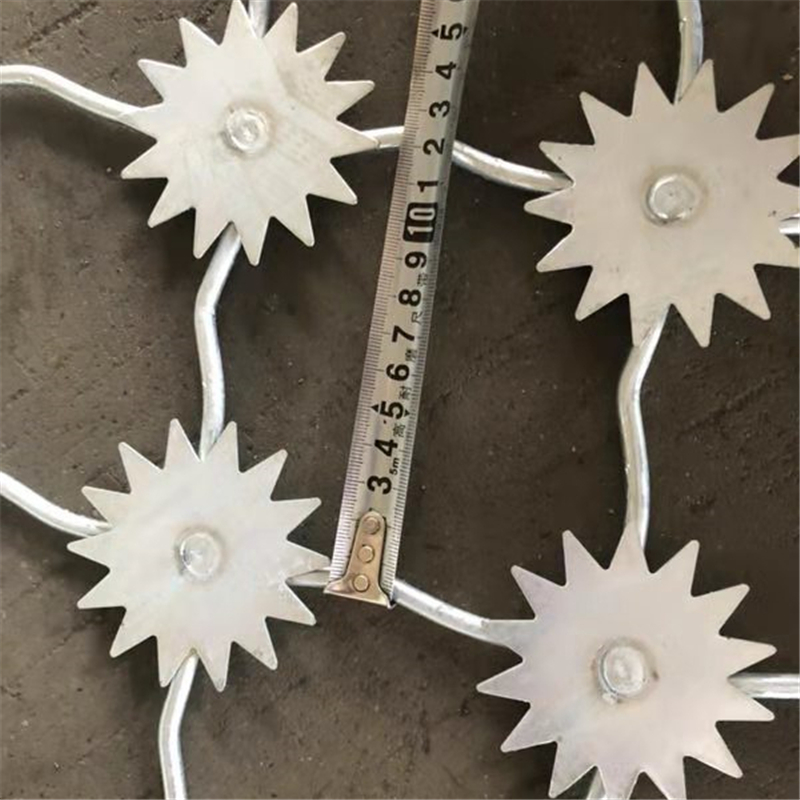 刺絲滾籠由刺絲連接卡扣與固定在支架上的縱向拉筋相連接,縱向拉筋與支架的連接采用冷拔鍍鋅鋼絲繞2圈后擰緊固定,支架設(shè)置在防護(hù)柵欄的立柱和跨中位置,期跨度進(jìn)設(shè)置與立柱上部