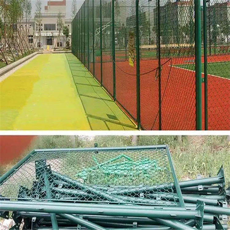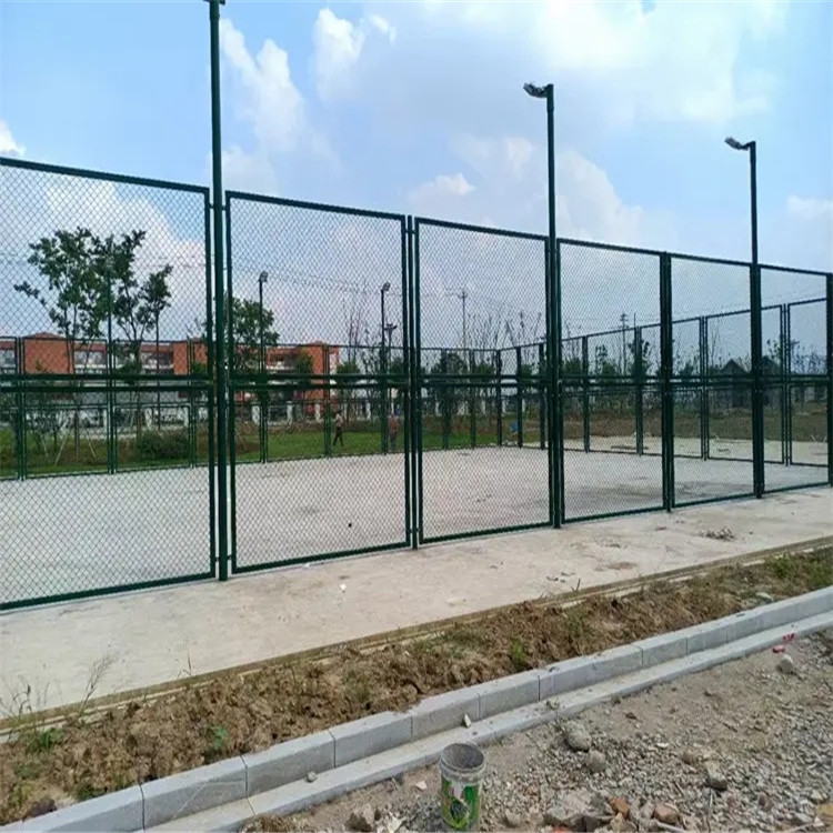 球場圍網施工工序為:底板固定-網立柱焊接-頂、底橫桿焊接-掛網施工-網門施工、噴漆。焊圍網地板及立柱:測量放線,按設計圖定好網柱及燈柱埋件位置。制作固定件,圍網立柱固定件尺寸為150×150×8,燈柱固定件尺寸 為200×200×10,打膨脹螺絲固定,螺絲長80mm以上。焊接立柱及橫桿。立柱門距為3m,立柱全部焊完后,方可開始焊上、下橫桿, 所有焊接均采電J422焊條,焊縫要求滿焊,焊縫高度及寬度均應大于0.7d。