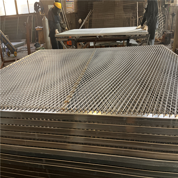 3.鋼板網(wǎng)制作:把成品板經(jīng)過機器沖剪拉伸成帶有菱形孔狀的鋼板網(wǎng),厚度、孔徑大小按要求,然后焊接在焊接好的邊框上面。
