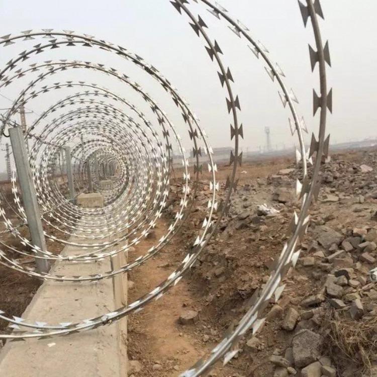 刺絲滾籠結構:熱鍍鋅板和鋼絲由銳利尖角鍍鋅鋼板或不銹鋼薄板做刀片,高張力鋼絲做芯線組合而成的阻絕器材。由于刺網(wǎng)造形獨特不易觸摸,因而能達到極好的防護隔離效果。