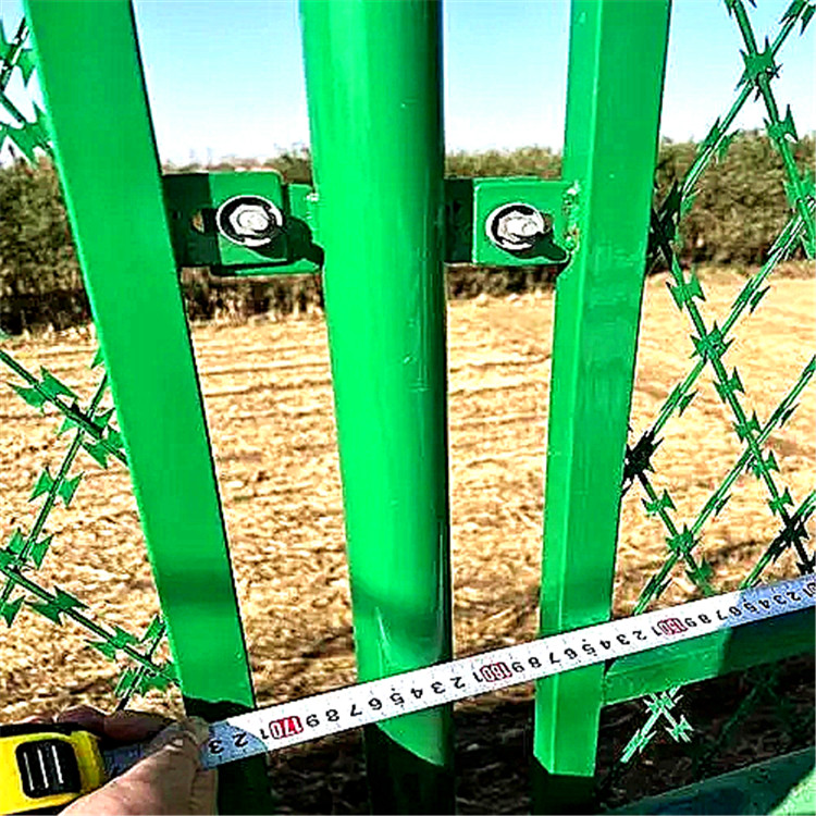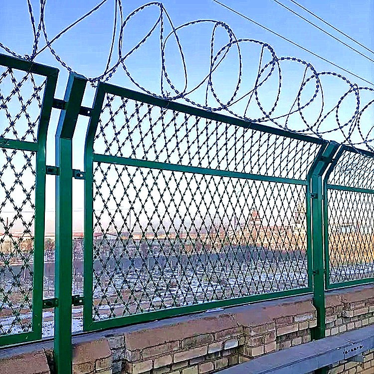 焊接型刀刺隔離網(wǎng)的制作工藝:把沖好的刀片裹在熱鍍鋅絲上面,經(jīng)調(diào)直達(dá)到預(yù)定的長度自動切斷,送入到模具內(nèi),排焊機把經(jīng)和緯相交叉的部分,沖過電流焊接到一起,數(shù)控電機拉動網(wǎng)片前進(jìn)一格,達(dá)到網(wǎng)片的長度后,排焊機自動停止工作,一張焊接好的刀片刺繩網(wǎng)片,就完成了,搭配Y型鋼立柱增加網(wǎng)片的穩(wěn)固性,表面處理的方式有兩種高亮銀粉磁漆處理和噴塑處理(也叫PVC處理)銀粉磁漆處理的優(yōu)點不影響刀片的鋒利,看起來刀片閃閃發(fā)亮,恐嚇性好,讓人望而生畏!適用于監(jiān)獄,軍事重地等。