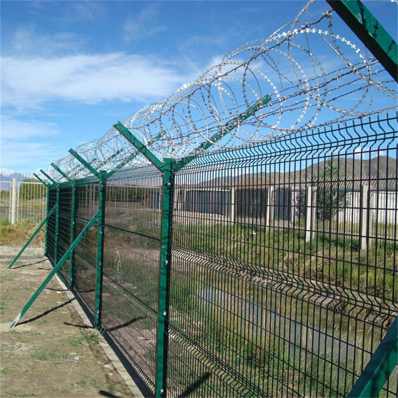 機(jī)場圍界又稱作“Y型安全防御護(hù)網(wǎng)”,是由V型支架立柱,加強(qiáng)型焊接片網(wǎng),安全防盜連接件和熱鍍鋅刀片刺籠組成強(qiáng)度和安全防御性級別很高。近年來,被廣泛應(yīng)用在機(jī)場,軍事基地等高安全場所。如果在機(jī)場護(hù)欄網(wǎng)頂部加裝刀片刺絲、刀片刺繩后又很好的增強(qiáng)了安全防護(hù)性能。機(jī)場護(hù)欄網(wǎng)造型美觀、花色多樣,既起到圍欄作用,又起到美化作用。由于具有安全性高、防攀爬能力好,網(wǎng)片連接方式采用特制SBS緊扣件,有效防止人為的破壞性拆卸,橫向四道折彎加強(qiáng)筋,使網(wǎng)面強(qiáng)度顯著增加。