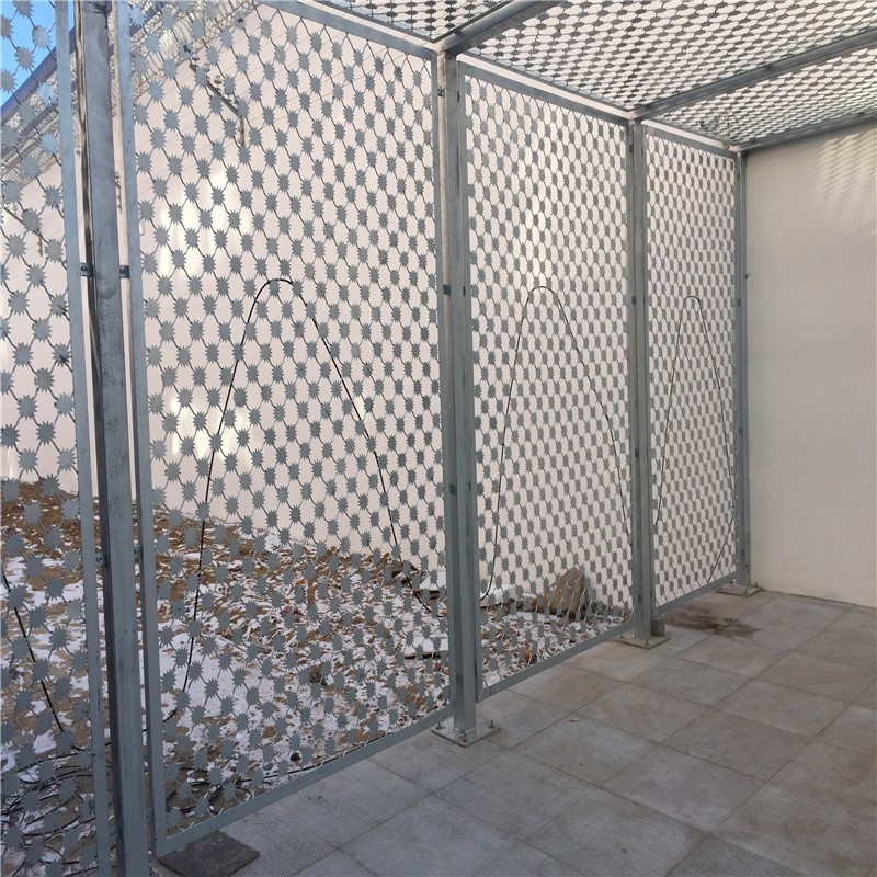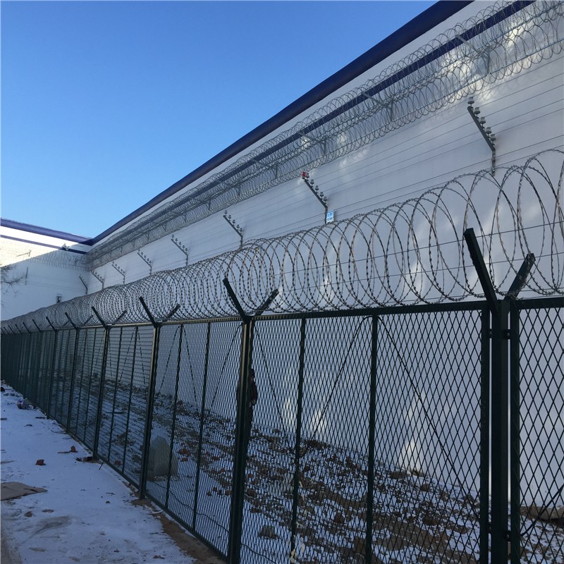 監(jiān)獄刀片刺網(wǎng)主要是由熱鍍鋅鋼板或不銹鋼薄板沖壓而成的,它擁有尖銳的刀片,高張力鍍鋅鋼絲或者不銹鋼絲做芯線組合而成的產(chǎn)品。由于刺網(wǎng)的形狀很特別,而且每個角度都有尖狀刀片,因而能達(dá)到極好的防御保護(hù)效果。產(chǎn)品具有結(jié)構(gòu)新穎、堅固緊密、網(wǎng)面平整、網(wǎng)孔均勻、刀鋒銳利、防攀爬、抗腐蝕性強(qiáng)等特點(diǎn)。建設(shè)于監(jiān)獄的內(nèi)外墻地面及高墻之上,形成一道高不可攀、難以逾越的隔離障礙。具有嚇阻、防翻越等效果,材質(zhì)堅硬,高強(qiáng)度,高張力,造型設(shè)計獨(dú)特,不宜觸摸,因而能達(dá)到極好的防護(hù)隔離效果.